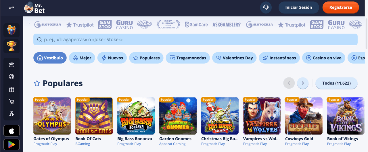 El catálogo de Mr Bet juegos está enfocado casi por completo en el entretenimiento de casino: miles de tragamonedas, juegos de mesa clásicos y un amplio apartado de casino en vivo. Los juegos de casino Mr Bet se organizan en secciones claras, por lo que es fácil cambiar entre slots, ruleta, blackjack, bacará o game shows en cuestión de segundos.