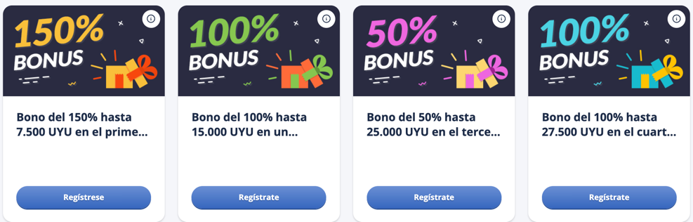 - 1.er depósito: bono del 150 % hasta 7 500 UYU, con requisito de apuesta de 45x el importe del bono.