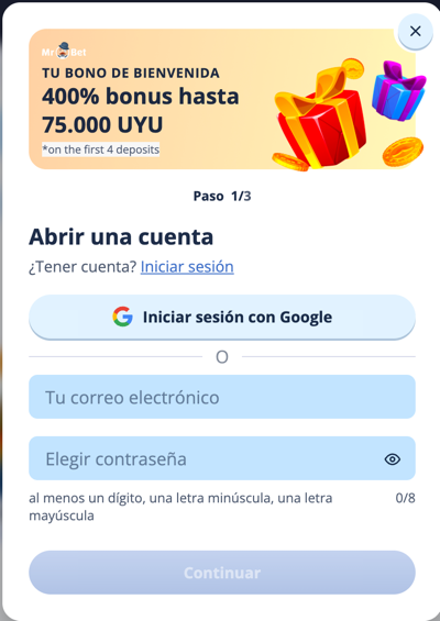 - Paso 1: Crear acceso con correo o Google. Entra al sitio oficial de Mr Bet y haz clic en «Registrarse». En la ventana que se abre puedes elegir iniciar sesión con Google o completar el formulario clásico. Introduce tu correo electrónico y crea una contraseña segura (con mayúsculas, minúsculas y números), luego pulsa «Continuar».